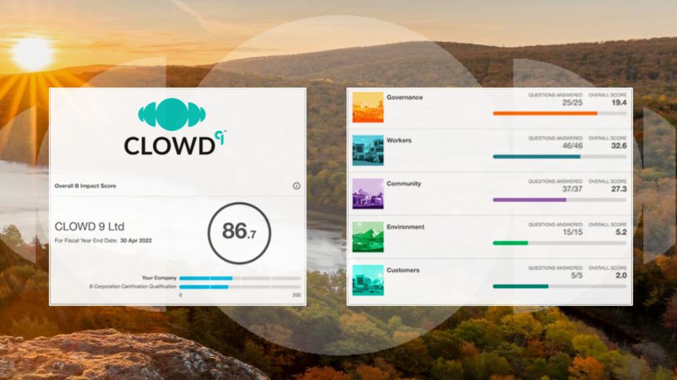 CLOWD9 scored 86.7 on the B Impact Assessment, certified in March 2023. This is well above the 80-point certification threshold and significantly higher than the median score of 50.9 for ordinary businesses. CLOWD9 is the world's first cloud-native, B Corp certified issuer payment processor.